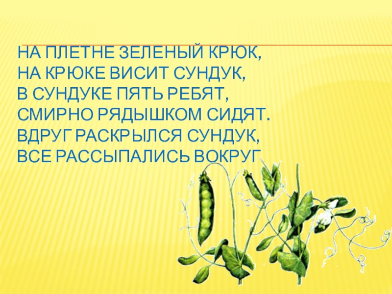 На плетне зеленый крюк, на крюке висит сундук, в сундуке пять ребят, смирно рядышком сидят. Вдруг раскрылся