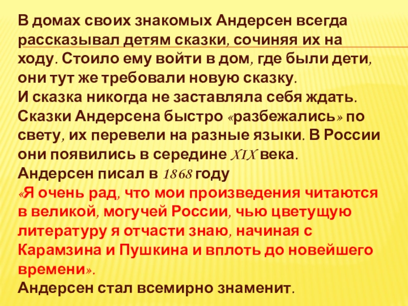 на ходу. Стоило ему войти в дом, где были дети, они тут же требовали новую сказку. И сказка никогда не заставляла себя ждать. Сказки Андерсена быстро «разбежались» по свету, их перевели на разные языки. В России они появились в середине XIX века. Андерсен писал в 1868 году «Я очень рад, что мои произведения читаются в великой, могучей России, чью цветущую литературу я отчасти знаю, начиная с Карамзина и Пушкина и вплоть до новейшего времени». Андерсен стал всемирно знаменит.