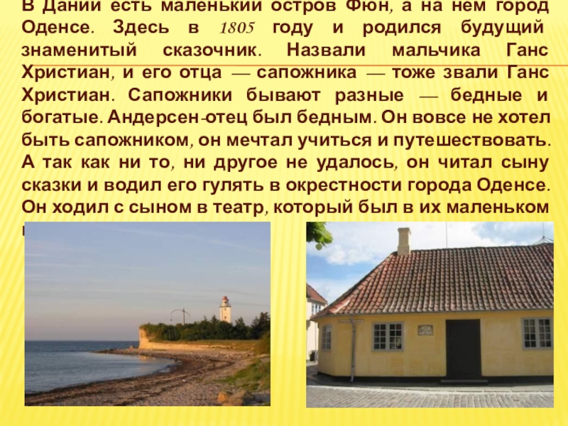 В Дании есть маленький остров Фюн, а на нем город Оденсе. Здесь в 1805 году и родился