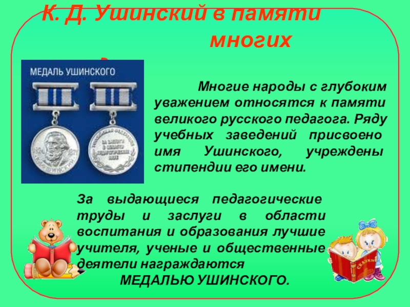 Многие народы с глубоким уважением относятся к памяти великого русского педагога. Ряду учебных заведений присвоено имя Ушинского, учреждены стипендии его имени.