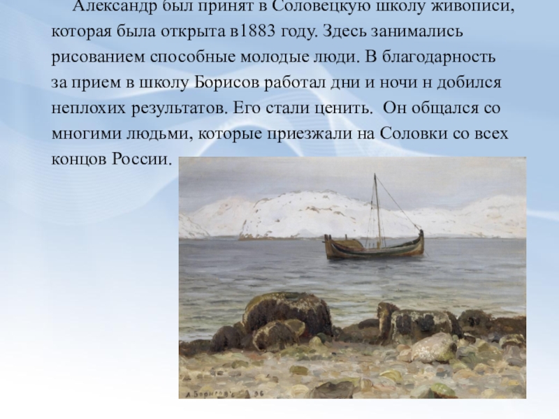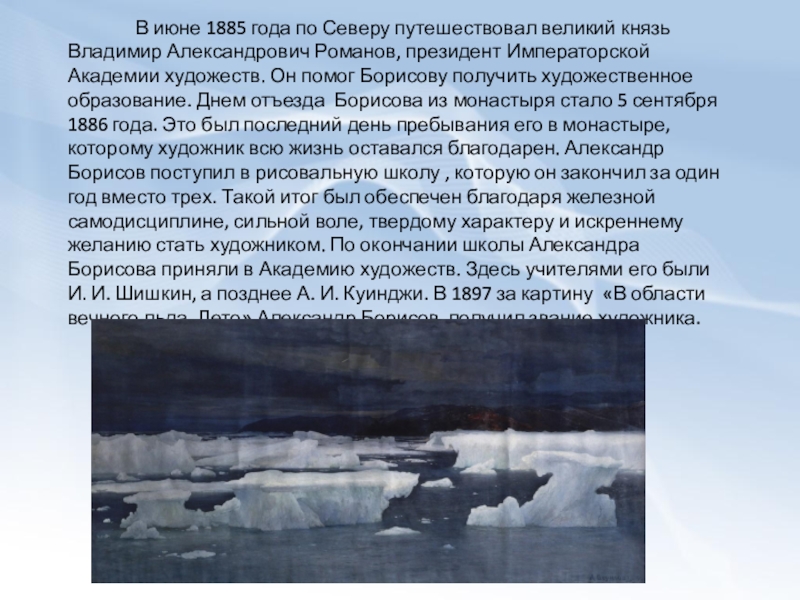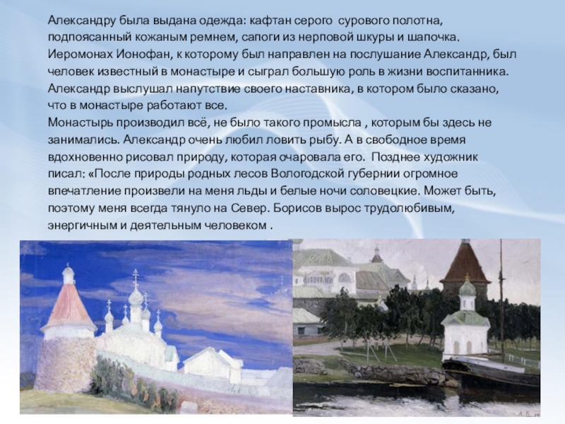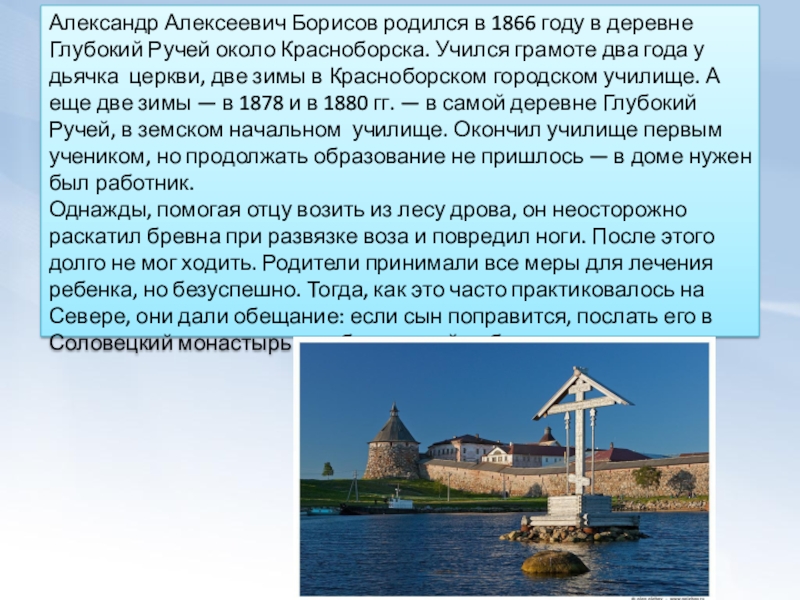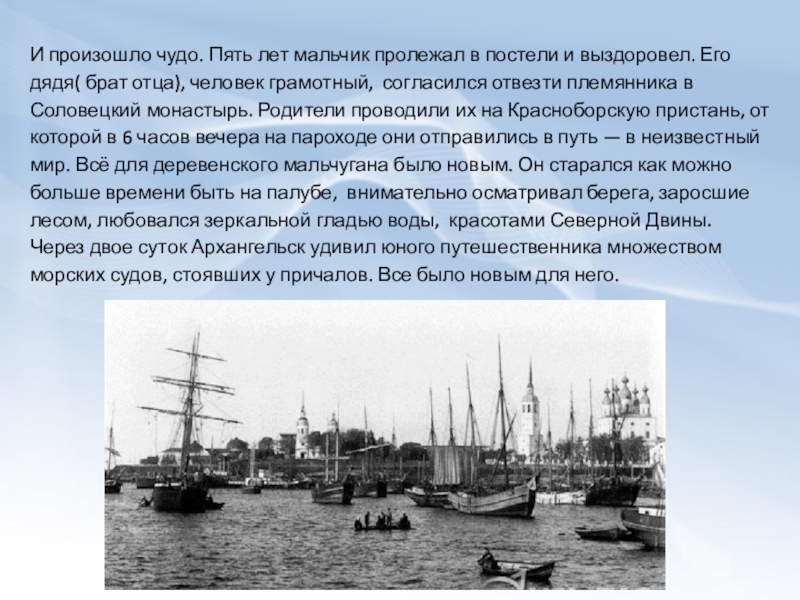 И произошло чудо. Пять лет мальчик пролежал в постели и выздоровел. Его дядя( брат отца), человек грамотный, согласился отвезти племянника в Соловецкий монастырь. Родители проводили их на Красноборскую пристань, от которой в 6 часов вечера на пароходе они отправились в путь — в неизвестный мир. Всё для деревенского мальчугана было новым. Он старался как можно больше времени быть на палубе, внимательно осматривал берега, заросшие лесом, любовался зеркальной гладью воды, красотами Северной Двины. Через двое суток Архангельск удивил юного путешественника множеством морских судов, стоявших у причалов. Все было новым для него.
