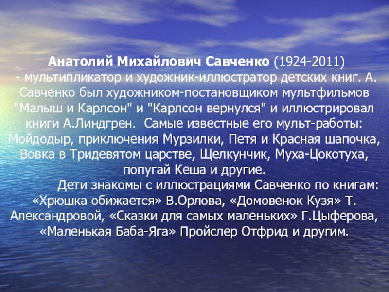 А.Савченко был художником-постановщиком мультфильмов "Малыш и Карлсон" и "Карлсон вернулся" и иллюстрировал книги А.Линдгрен. Самые известные его мульт-работы: Мойдодыр, приключения Мурзилки, Петя и Красная шапочка, Вовка в Тридевятом царстве, Щелкунчик, Муха-Цокотуха, попугай Кеша и другие.