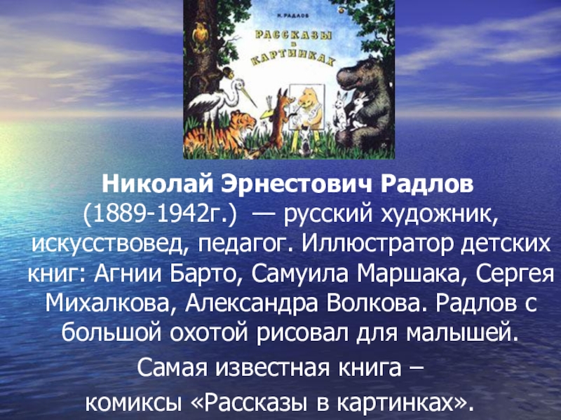 детских книг: Агнии Барто, Самуила Маршака, Сергея Михалкова, Александра Волкова. Радлов с большой охотой рисовал для малышей.