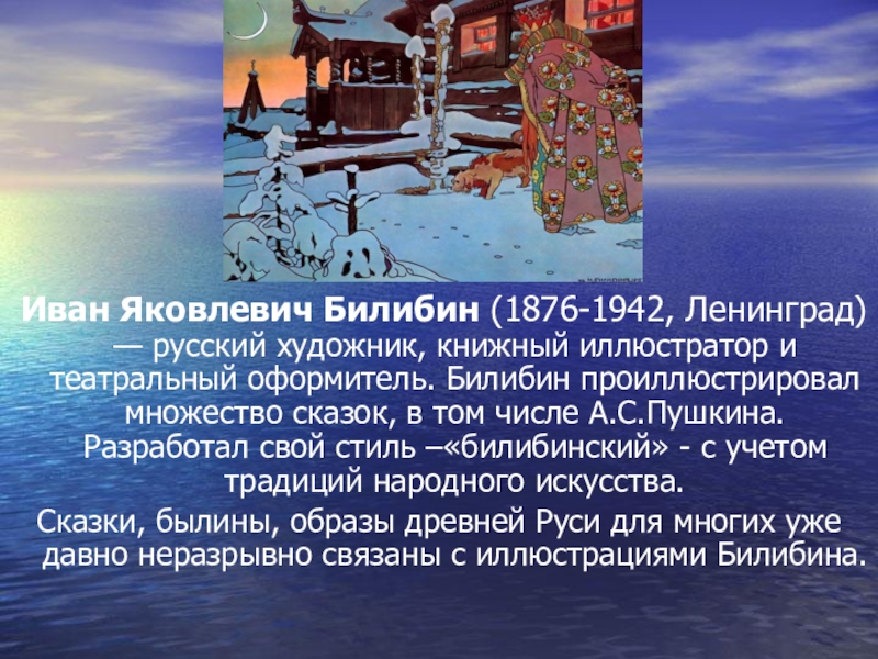 и театральный оформитель. Билибин проиллюстрировал множество сказок, в том числе А.С.Пушкина. Разработал свой стиль –«билибинский» - с учетом традиций народного искусства.