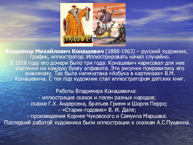 Слайд 13Владимир Михайлович Конашевич (1888-1963) – русский художник, график, иллюстратор. Иллюстрировать начал