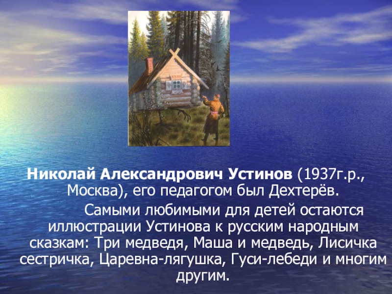 Самыми любимыми для детей остаются иллюстрации Устинова к русским народным сказкам: Три медведя, Маша и медведь, Лисичка сестричка, Царевна-лягушка, Гуси-лебеди и многим другим.