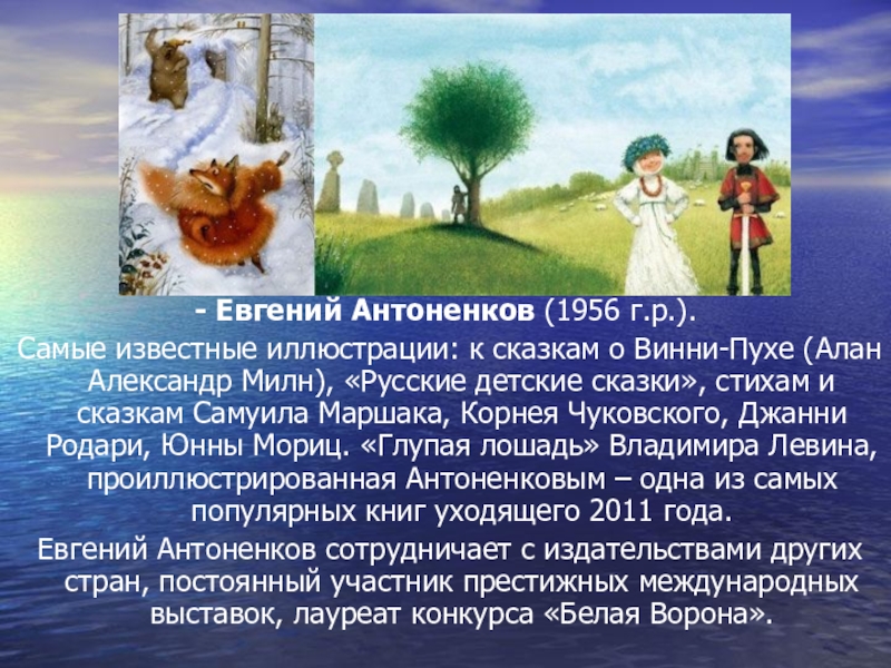 Евгений Антоненков сотрудничает с издательствами других стран, постоянный участник престижных международных выставок, лауреат конкурса «Белая Ворона».