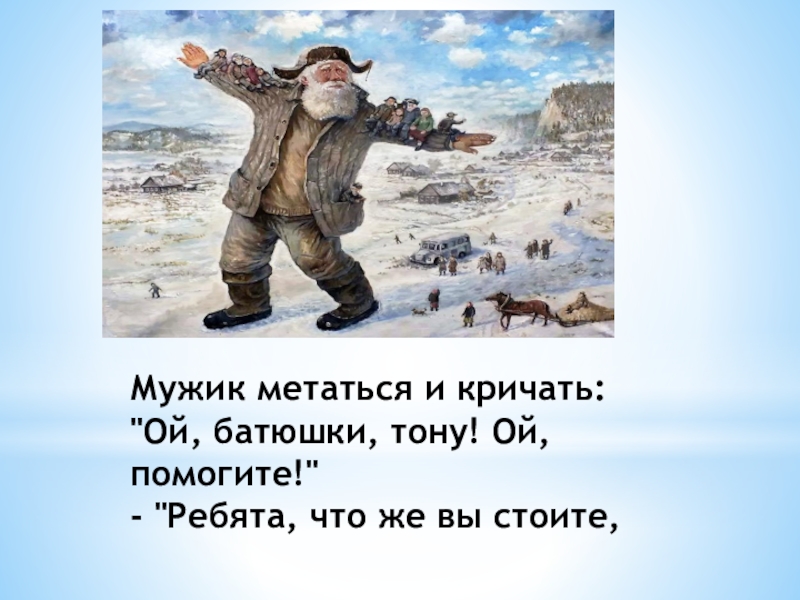 Слайд 12Мужик метаться и кричать: "Ой, батюшки, тону! Ой, помогите!" - "Ребята, что же