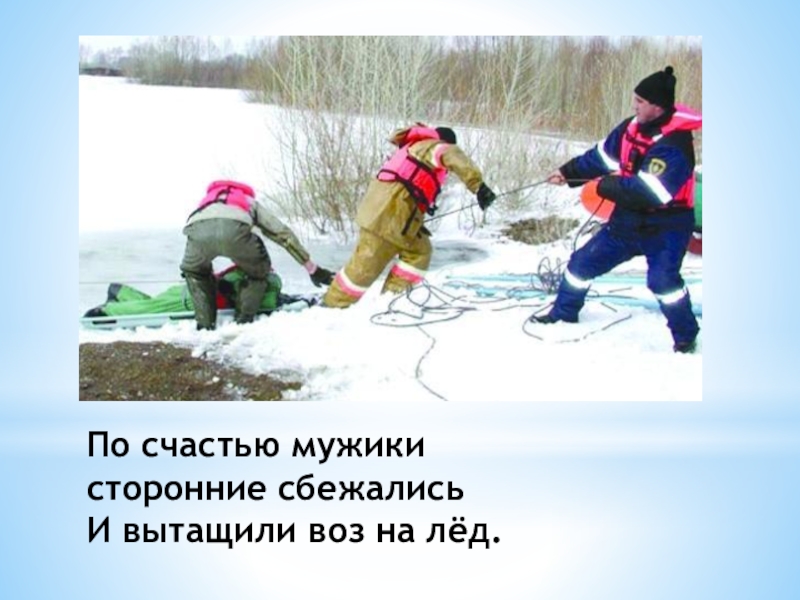 Слайд 18По счастью мужики сторонние сбежались И вытащили воз на лёд.