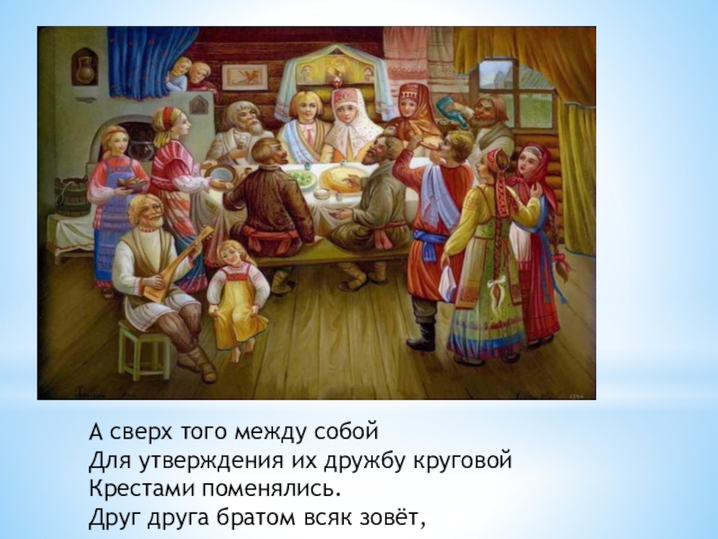 Слайд 16А сверх того между собой Для утверждения их дружбу круговой Крестами поменялись. Друг друга