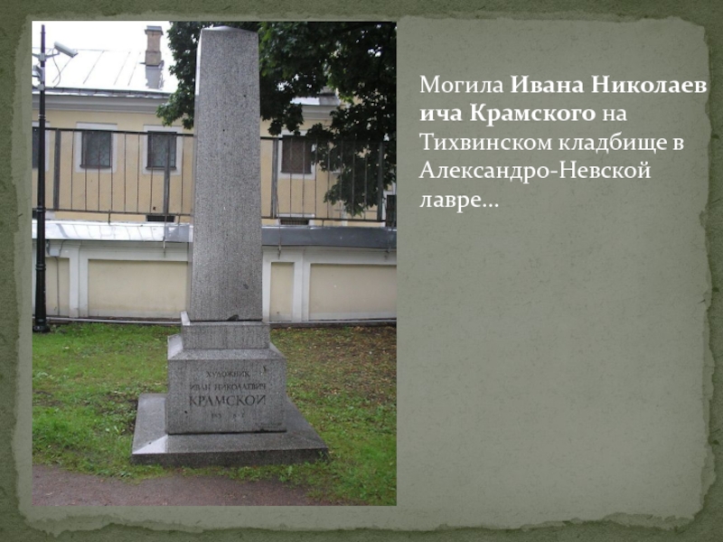 Слайд 9Могила Ивана Николаевича Крамского на Тихвинском кладбище в Александро-Невской лавре...