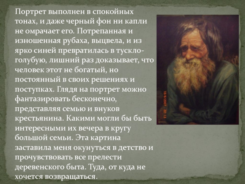 не омрачает его. Потрепанная и изношенная рубаха, выцвела, и из ярко синей превратилась в тускло-голубую, лишний раз доказывает, что человек этот не богатый, но постоянный в своих решениях и поступках. Глядя на портрет можно фантазировать бесконечно, представляя семью и внуков крестьянина. Какими могли бы быть интересными их вечера в кругу большой семьи. Эта картина заставила меня окунуться в детство и прочувствовать все прелести деревенского быта. Туда, от куда не хочется возвращаться.