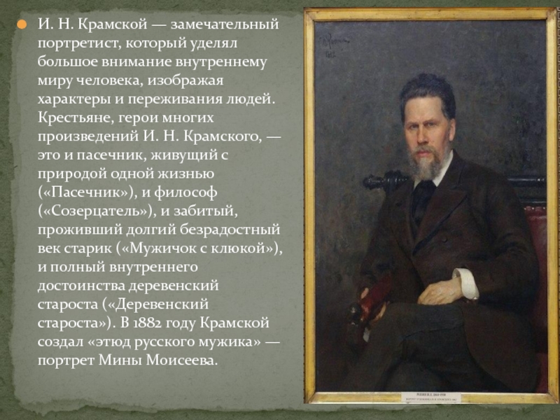 миру человека, изображая характеры и переживания людей. Крестьяне, герои многих произведений И. Н. Крамского, — это и пасечник, живущий с природой одной жизнью («Пасечник»), и философ («Созерцатель»), и забитый, проживший долгий безрадостный век старик («Мужичок с клюкой»), и полный внутреннего достоинства деревенский староста («Деревенский староста»). В 1882 году Крамской создал «этюд русского мужика» — портрет Мины Моисеева.