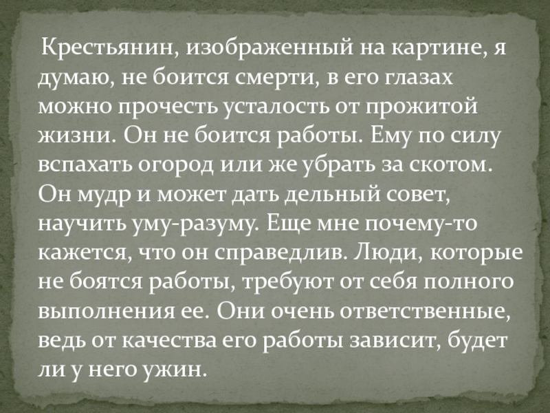 Слайд 18 Крестьянин, изображенный на картине, я думаю, не боится смерти, в его
