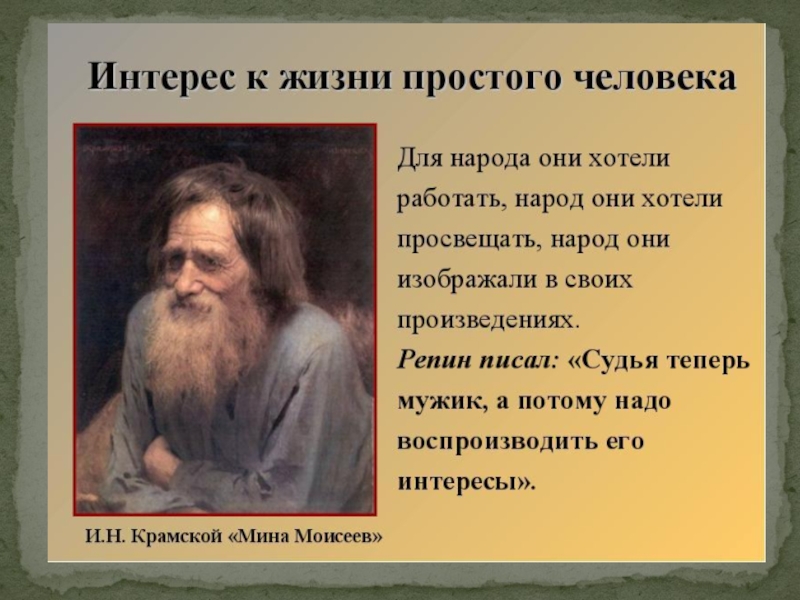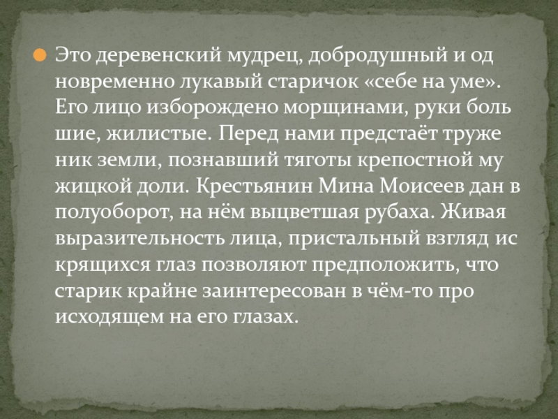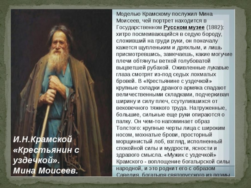 Слайд 16Крамской в своем портрете «Мина Моисеев» изобразил крестьянина. Пожилой дедушка смотрит