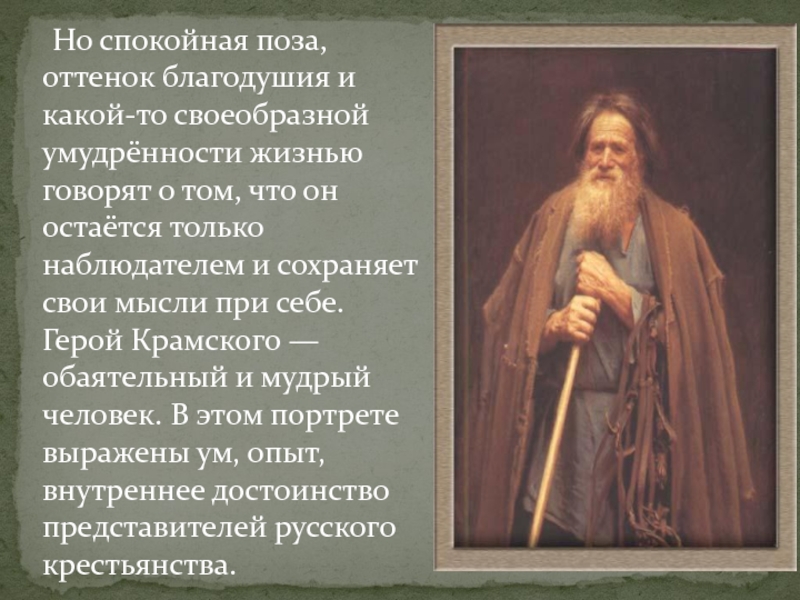 говорят о том, что он остаётся только наблюдателем и сохраняет свои мысли при себе. Герой Крамского — обаятельный и мудрый человек. В этом портрете выражены ум, опыт, внутреннее достоинство представителей русского крестьянства.