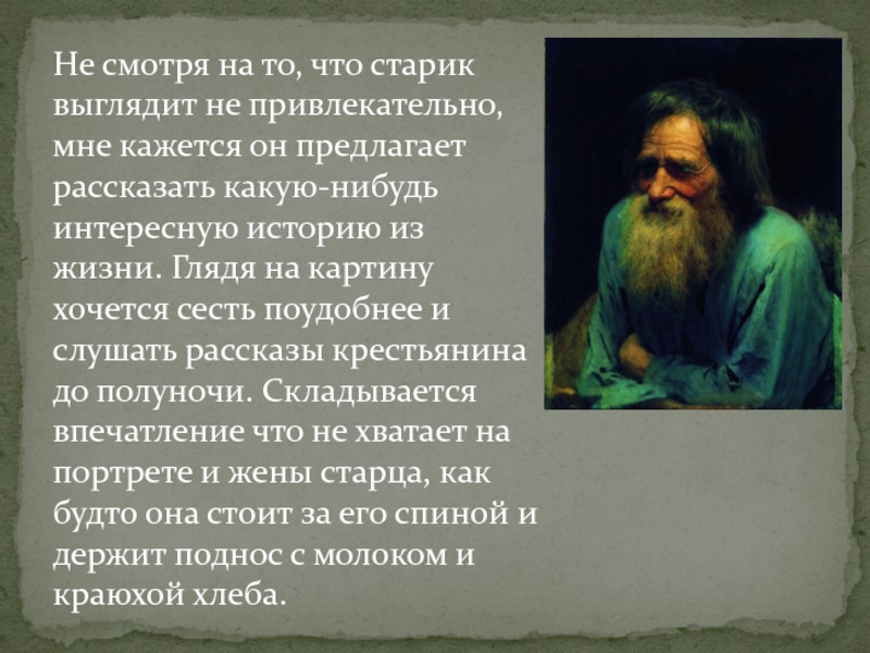 он предлагает рассказать какую-нибудь интересную историю из жизни. Глядя на картину хочется сесть поудобнее и слушать рассказы крестьянина до полуночи. Складывается впечатление что не хватает на портрете и жены старца, как будто она стоит за его спиной и держит поднос с молоком и краюхой хлеба.
