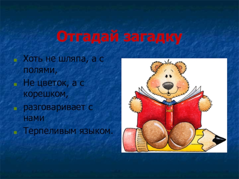 Отгадай загадкуХоть не шляпа, а с полями,Не цветок, а с корешком,разговаривает с намиТерпеливым языком.