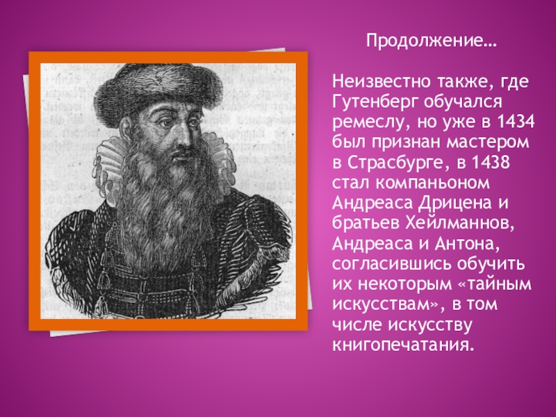 Неизвестно также, где Гутенберг обучался ремеслу, но уже
