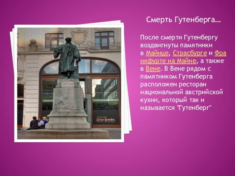 в Вене. В Вене рядом с памятником Гутенберга расположен ресторан национальной австрийской кухни, который так и называется "Гутенберг"