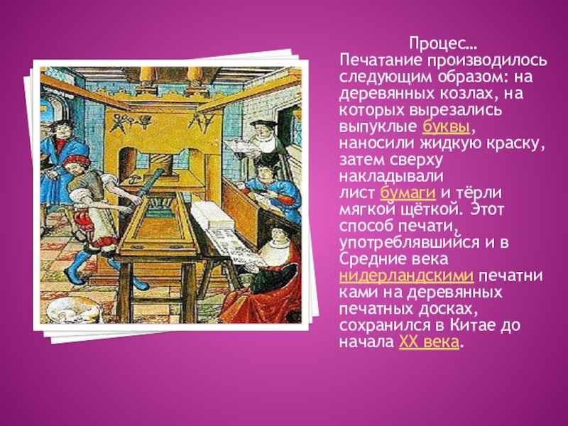 Печатание производилось следующим образом: на деревянных козлах, на которых вырезались выпуклые буквы,