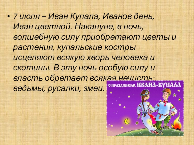 Слайд 67 июля – Иван Купала, Иванов день, Иван цветной. Накануне, в