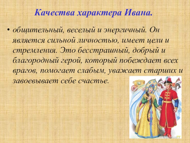 Качества характера Ивана.общительный, веселый и энергичный. Он является сильной личностью, имеет цели и стремления. Это бесстрашный, добрый