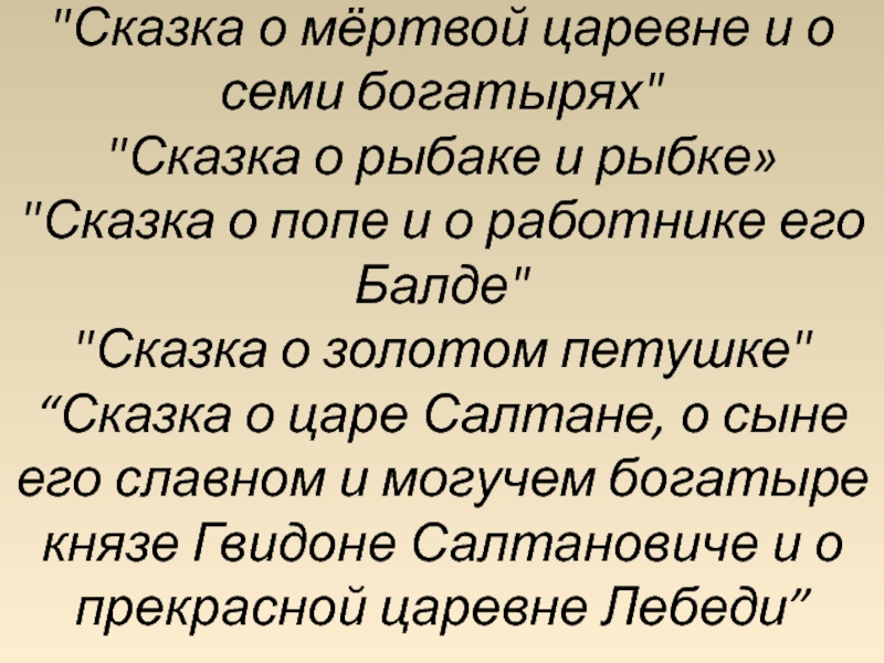 рыбке» "Сказка о попе и о работнике его Балде" "Сказка о золотом петушке" “Сказка о царе Салтане, о сыне его славном и могучем богатыре князе Гвидоне Салтановиче и о прекрасной царевне Лебеди”