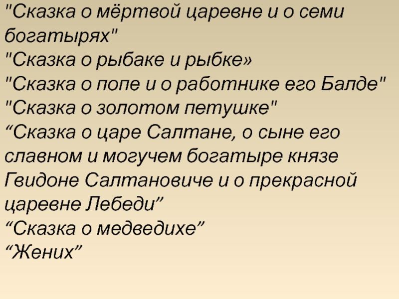 рыбке» "Сказка о попе и о работнике его Балде" "Сказка о золотом петушке" “Сказка о царе Салтане, о сыне его славном и могучем богатыре князе Гвидоне Салтановиче и о прекрасной царевне Лебеди” “Сказка о медведихе” “Жених”