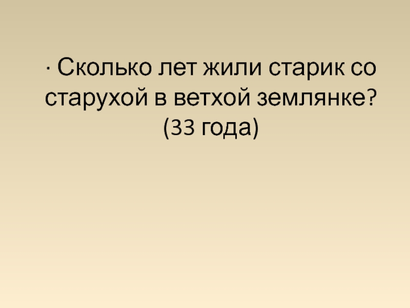 Слайд 32· Сколько лет жили старик со старухой в ветхой землянке? (33 года)