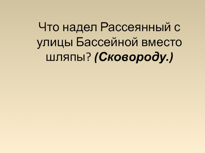 Слайд 40Что надел Рассеянный с улицы Бассейной вместо шляпы? (Сковороду.)