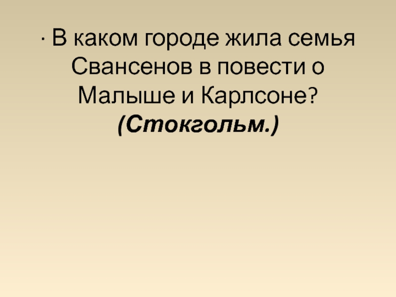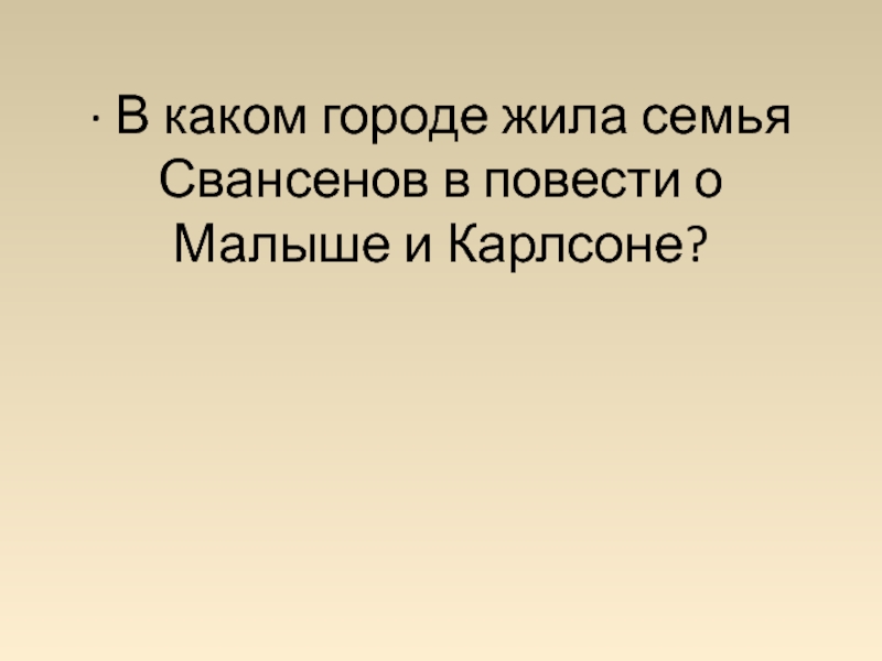 Слайд 34 · В каком городе жила семья Свансенов в повести о Малыше