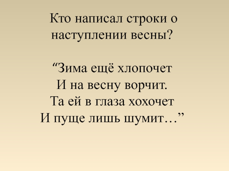 Слайд 71 Кто написал строки о наступлении весны? “Зима ещё хлопочет И на весну