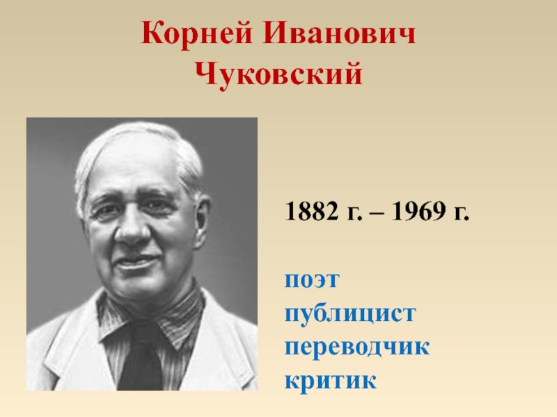 Корней Иванович  Чуковский1882 г. – 1969 г.поэтпублицистпереводчик критик