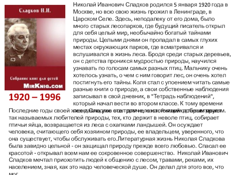 Последние годы своей жизни Сладков все громче, настойчивей останавливает так называемых любителей природы, тех, кто держит в неволе птиц, собирает птичьи яйца, возвращается из леса с охапками ландышей. Он осуждает человека, считающего себя хозяином природы, ее владельцем, уверенного, что она существует, чтобы обслуживать его.Литературная жизнь Николая Сладкова была завидно цельной - он защищал природу прежде всего любовью. Спасал ее красотой - открывал всем нам ее сокровенное совершенство. Николай Иванович Сладков мечтал приохотить людей к общению с лесом, травами, реками, их населением, зная, как это надо человеческой душе. Он делал для этого все, что мог.