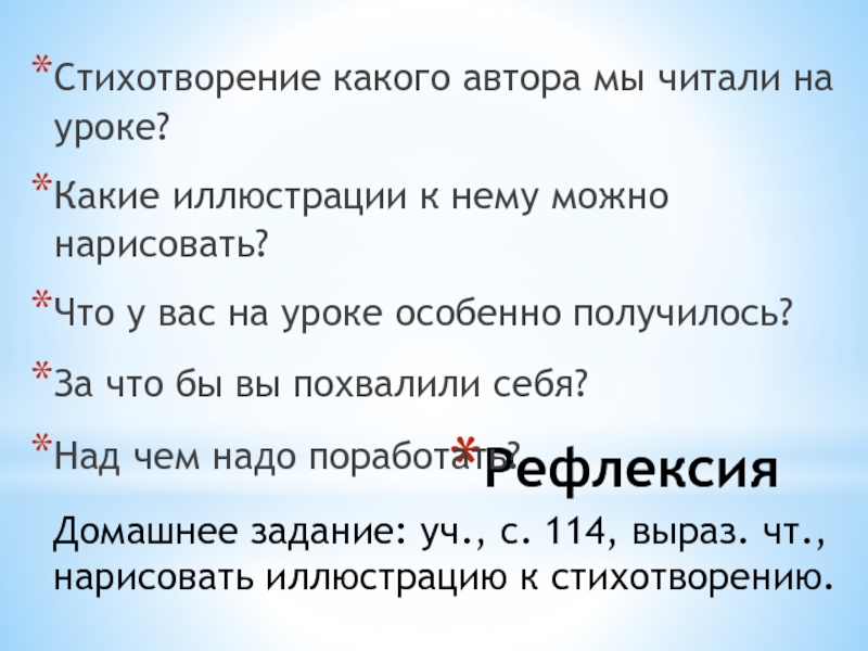 Домашнее задание: уч., с. 114, выраз. чт.,