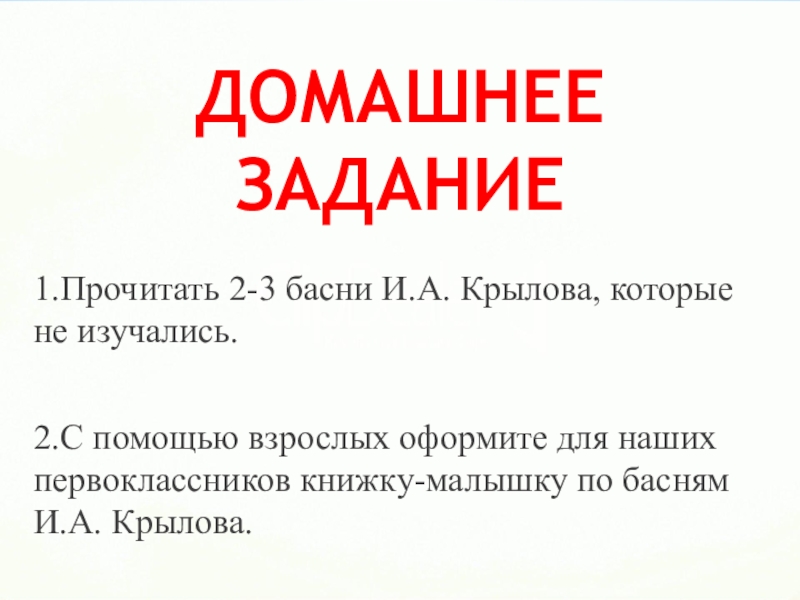 ДОМАШНЕЕ ЗАДАНИЕ1.Прочитать 2-3 басни И.А. Крылова, которые не изучались.2.С помощью взрослых оформите для наших первоклассников книжку-малышку по