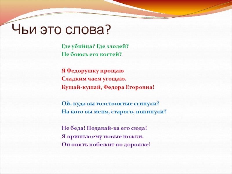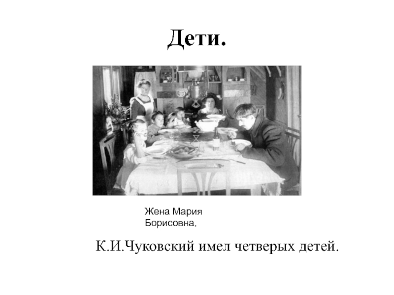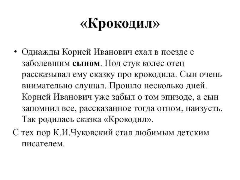колес отец рассказывал ему сказку про крокодила. Сын очень внимательно слушал. Прошло несколько дней. Корней Иванович уже забыл о том эпизоде, а сын запомнил все, рассказанное тогда отцом, наизусть. Так родилась сказка «Крокодил».