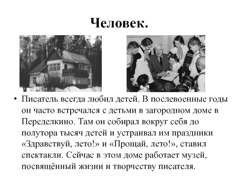 детьми в загородном доме в Переделкино. Там он собирал вокруг себя до полутора тысяч детей и устраивал им праздники «Здравствуй, лето!» и «Прощай, лето!», ставил спектакли. Сейчас в этом доме работает музей, посвящённый жизни и творчеству писателя.
