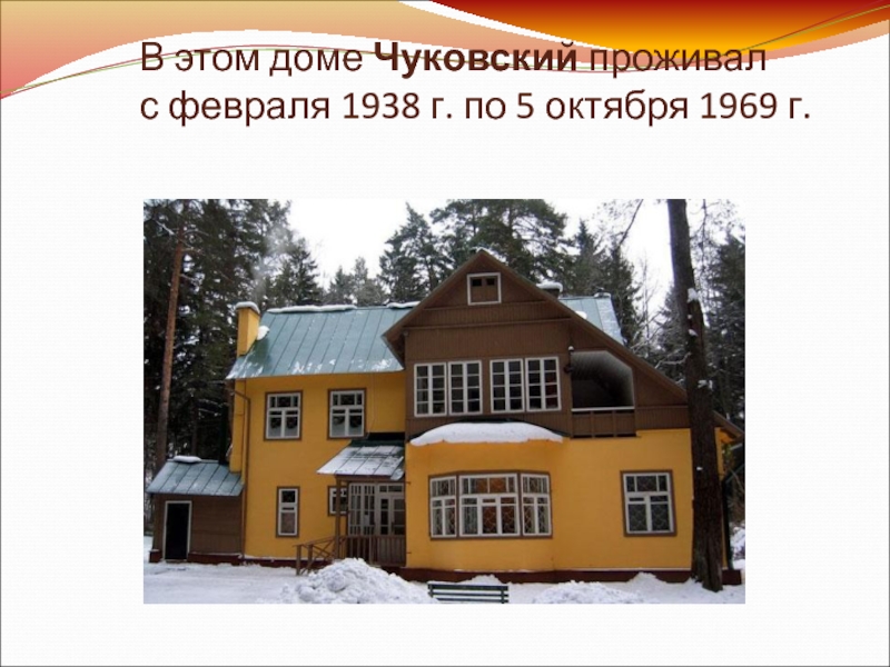Слайд 3В этом доме Чуковский проживал с февраля 1938 г. по 5 октября 1969 г.