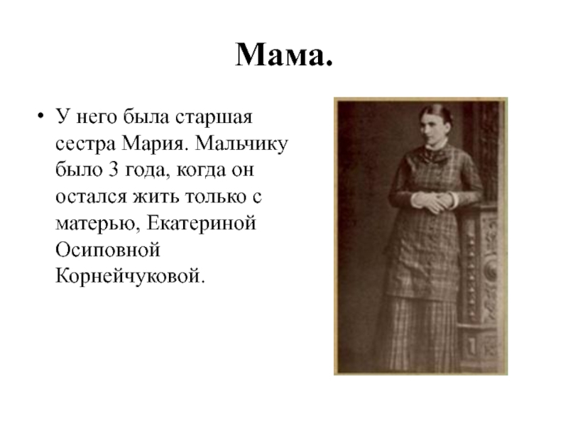 он остался жить только с матерью, Екатериной Осиповной Корнейчуковой.