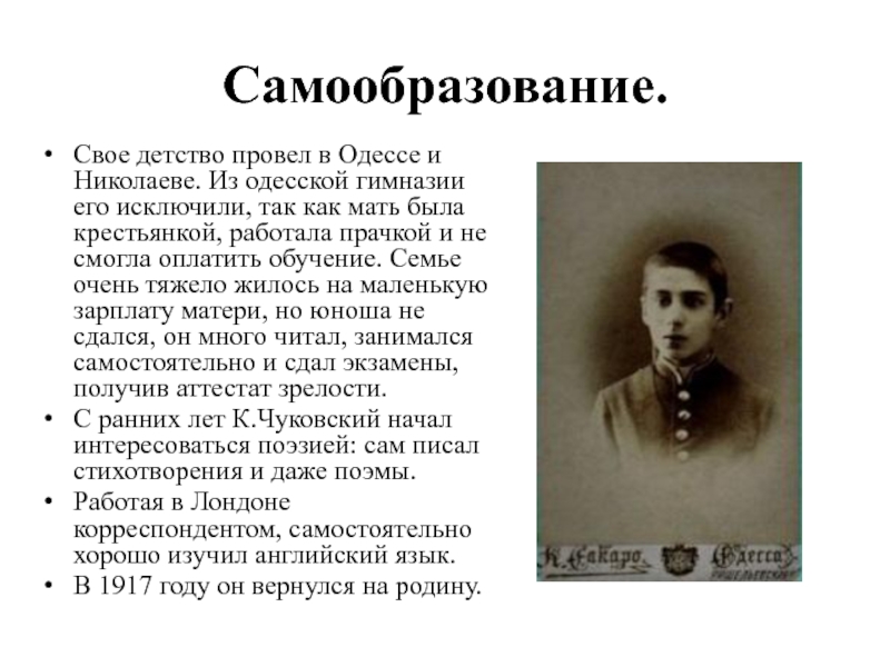 С ранних лет К.Чуковский начал интересоваться поэзией: сам писал стихотворения и даже поэмы.