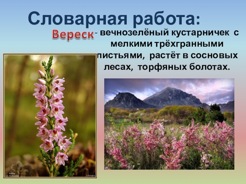 Словарная работа:- вечнозелёный кустарничек с мелкими трёхгранными листьями, растёт в сосновых лесах, торфяных болотах.