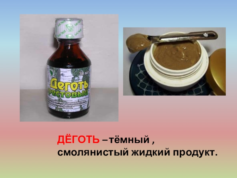Слайд 18ДЁГОТЬ – тёмный , смолянистый жидкий продукт.