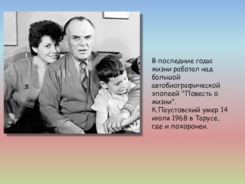 жизни". К.Паустовский умер 14 июля 1968 в Тарусе, где и похоронен.