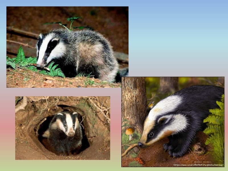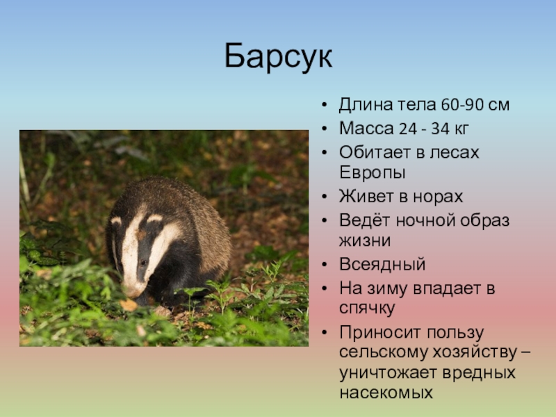 БарсукДлина тела 60-90 смМасса 24 - 34 кгОбитает в лесах ЕвропыЖивет в норахВедёт ночной образ жизниВсеядныйНа зиму