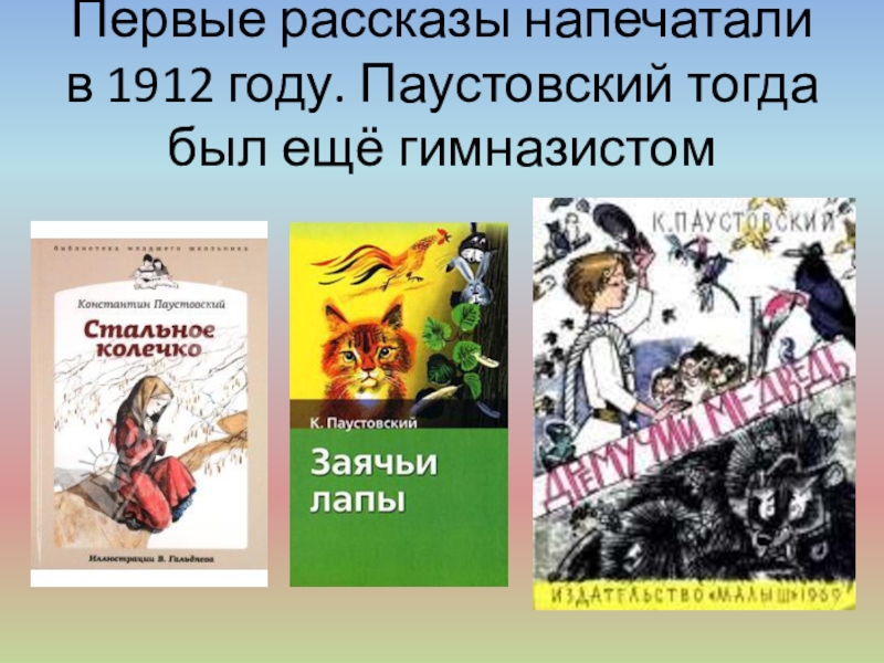 Слайд 6Первые рассказы напечатали в 1912 году. Паустовский тогда был ещё гимназистом