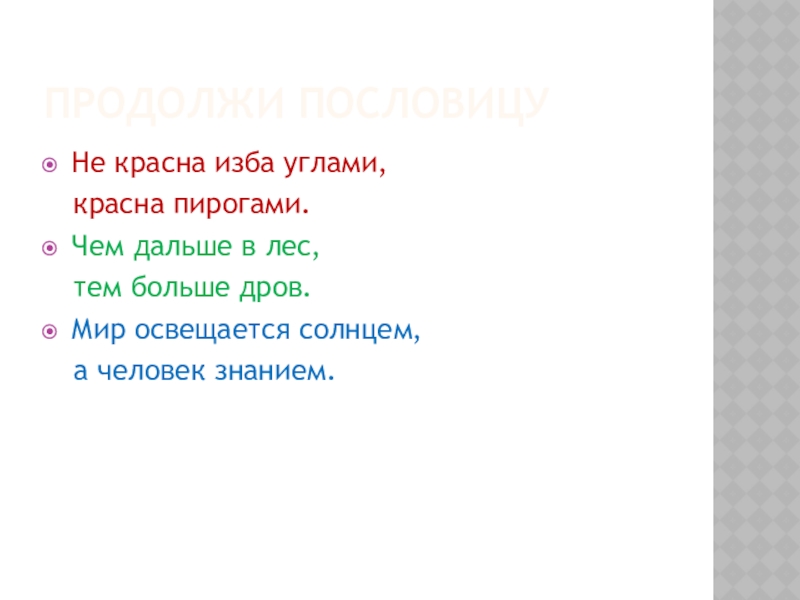 Продолжи пословицуНе красна изба углами,  красна пирогами.Чем дальше в лес,  тем больше дров.Мир освещается солнцем,