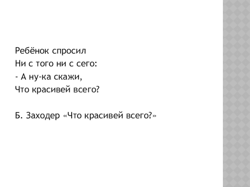 Ребёнок спросил Ни с того ни с сего:- А ну-ка скажи,Что красивей всего?Б. Заходер «Что красивей всего?»