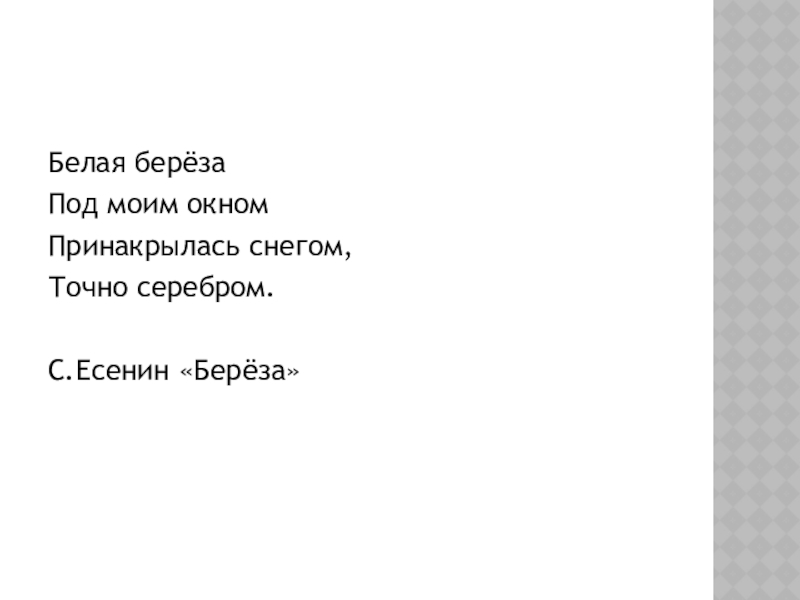 Белая берёза Под моим окномПринакрылась снегом,Точно серебром.С.Есенин «Берёза»